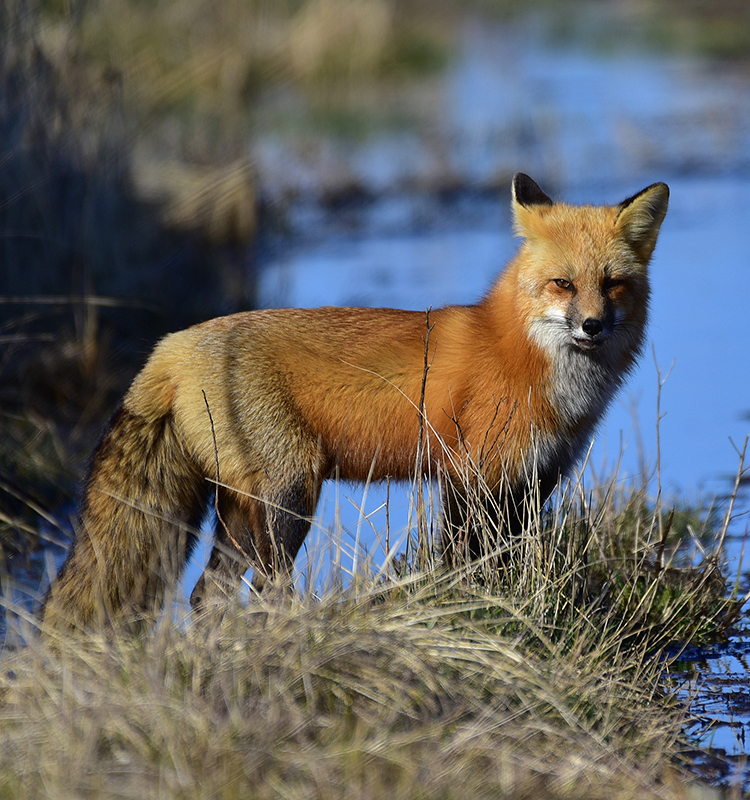 Red foxes are commonly found in mixed forest. They are most active in early morning and dusk. Omnivores, they eat a wide varriety of food including small mammals, insects and berries. It is common so see them prowling along the edges of the highway looking for prey. Please remember that feeding is strictly prohibited and dagerous to the Foxes' well-being.